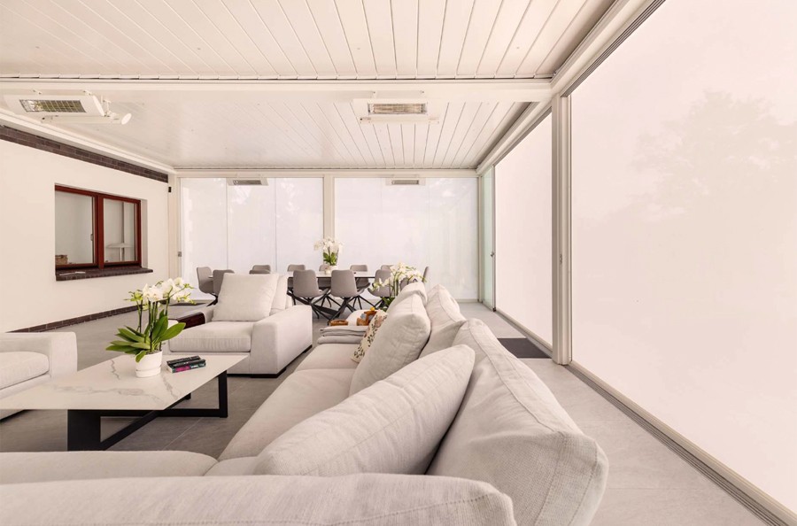Speziell für moderne Terrassen, oft mit großer Fläche, die wir mit ZIP-Rollläden ausstatten wollen. Er eignet sich als Pavillon im Garten, als Erweiterung des Wohnzimmers zu Hause oder als Terrassenüberdachung für ein Restaurant.